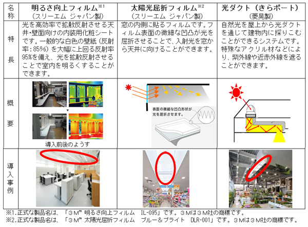 ●開発背景 大和ハウス工業では、2011年11月、法人のお客さま向けの建築物について、2020年までに「環境負荷ゼロ」(運用時のCO2排出量をゼロ)を目指す「Smart-Eco Project(スマートエコプロジェクト)」をスタートさせ、パッシブ技術の開発などを通じて次世代環境配慮型建築「D’s SMART」シリーズの提案強化を図っています。 そのような中、大和ハウス工業は2012年5月より、「ハックドラッグ小塚店」において「明るさ向上フィルム」と「太陽光屈折フィルム」、「光ダクト(きらポート)」を採用し、実運用しながら効果検証を行ってきました。 そして、2014年9月には大和ハウス工業が建設した「D’s SMART」シリーズにおける「店舗環境に対する評価調査」を実施し、自然光と拡散光(※3)を両立させることで、従業員の業務効率が向上し、照明電力を従來比30%以上削減できる(※4)ことを検証しました。 この実証実験で得られたデータをもとに、大和ハウス工業は、スリーエム ジャパンと菱晃の協力を得て、2014年12月、3つの製品を組み合わせた「自然採光システム」を確立しました。 今後も、大和ハウス工業では、次世代環境配慮型建築「D’s SMART」シリーズなど多くの建物で「自然採光システム」を採用いただくことで、「環境負荷ゼロ」と建物內での快適性向上を図っていきます。 ※3.光が物體にあたり反射拡散した光のこと。 ※4.晝光センサー制御付のLED照明のみの照明電力と比較した場合。 |