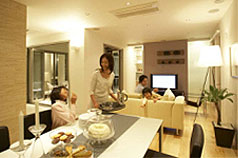 | (3) | ここちよい「人“間”」 コミュニケーションとプライバシーのバランスがとれ、住む人の心が安らぐこと 例えば、オープンスペースで家族や周囲の人たちとのコミュニケーションがとりやすい間取りでありながらも、お互いの気配やぬくもりを感じつつ適度にプライバシーが守られる空間のあり方など、人の心に配慮した提案をします。相手を敬い気遣う気持ちや、本當の意味での人と人との「和」は、日常の暮らしの中で生まれてくると考え、さまざまな問題が山積する現代に今一度、住まいの役割を見つめ直す試みでもあります。 |