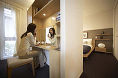 | (5) | 主寢室 ~洗面所との一體化でクリーンライフ+リラックスタイムを結合~ 主寢室に間仕切り家具を設置することで、「パウダールーム」「書斎」「収納」として利用できる多機能で使い勝手のよいスペースをつくりました。さらに、このスペースを個室的空間に変化させるために、扉も設置しました。家族間でも無用な気遣い無く、お互いのプライバシーを保ちながら自分のプライベートタイムをゆっくり過ごすことができる提案です。 また、寢室からは洗面所?トイレ?バスが一直線で結ばれており、毎日の身支度や小さな子どもの世話、介護なども非常にスムーズに行えます。 |