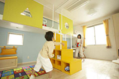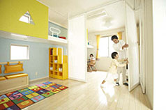 | (6) | 子ども部屋 ~子どもの成長に合わせてフレキシブルな空間を実現~ 部屋を壁で間仕切るのではなく、可動式の扉で分ける提案です。子どもが幼いときや友達が大勢來たときには共有のオープンスペースとして使用しますが、子どもが風邪をひいたり、1人で勉強に集中したいとき、また、成長した際にはこの可動式の扉で間仕切り、個室として使用することができます。將來、子どもが獨立した場合は、元のオープンスペースに戻すこともできる、フレキシブルな空間の提案です。 |