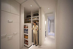 | (4) | くつろぎ空間 ~リビングでの過ごし方に余裕を持たせる新しい空間~ リビングの奧に設けたすりガラスの扉を開けると、その奧には物入れスペースが現れます。リビングは、家族それぞれの持ち物が集まってくる、家の中でいつも散らかりがちな場所ですが、家族の持ち物に指定席を設け、出し入れしやすい環境を作ることで、リビングがいつもスッキリと落ち著ける快適なスペースとなります。左右二枚の扉で安心と快適を生み出す提案です。 |
