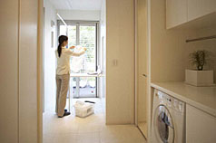 | (2) | 暮らしのバックヤード ~快適な暮らしを実現するユーティリティースペース~ 勝手口とリビング?ダイニング?キッチンなどを結ぶ動線をただの通路にするのではな く、食品庫、ゴミスペース、洗濯スペースなど家事に重要なスペースとして有効活用して います。食品庫は、扉がフレキシブルに動くことにより、開けておけばフルオープンな食品庫、閉めれば大容量の物置へと変化します。また、ユーティリティに內蔵された扉を開けば、扉がそのまま家事機に変化します。家の中の荷物の量の変化や來客數、家事內容によって、必要に応じて、臨機応変に家が暮らしに合わせてくれる扉の提案です。 |
