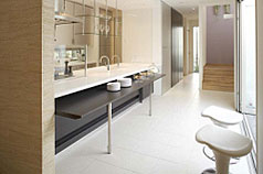 | (3) | キッチンライフ ~シーンに対応するフレキシブルなキッチン~ スライド扉を開閉させることにより、キッチンを獨立型、対面型、アイランド型とその場の“シーン”に合わせてフレキシブルに変化させる提案です。 獨立型キッチンにも、オープン型キッチンにも、それぞれの長所?短所がありますが、扉で「見せる」と「隠す」を自由自在にコントロールし使い分けができると、家事のストレスは軽減されます。また、家族やお客様とも、プライバシーとコミュニケーションを上手に両立させることが可能となります。 |