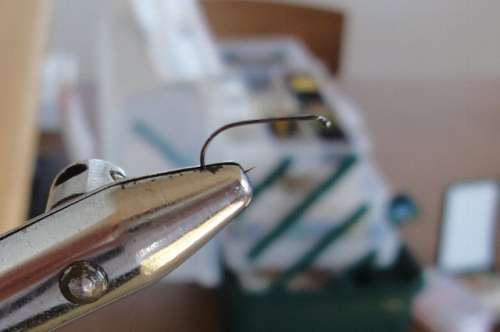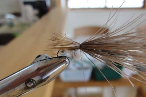 ①ハックルを固定したら②エルクヘアを適量刈り取り③スタッカーを使い毛先を揃えます④スレッドで⑥フライフックに巻きとめます。ヘッド(頭)側の余分な毛を⑧はさみでカットし完成です。