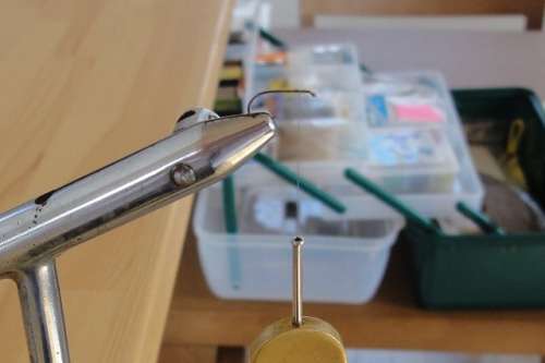 まず、⑥フライフックをタイイングバイス(萬力)に固定し、④スレッド(糸)を下巻きしてゆきます。