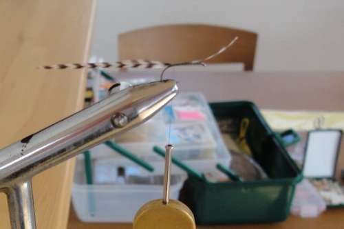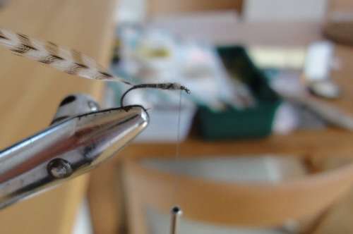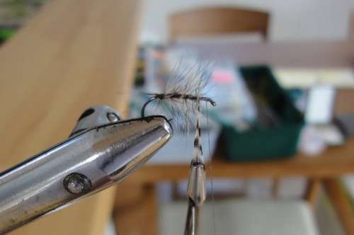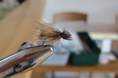 エルクヘアカディス(ヘラジカの毛で作ったトビゲラのイミテーションフライ)のつもりですが指南書の見本と比べるとちょっと違うような???
