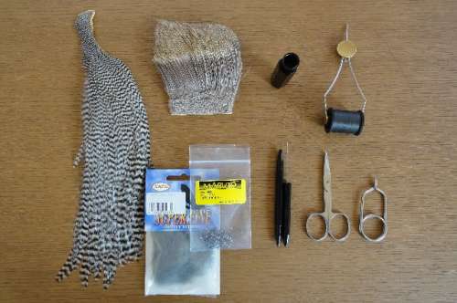 左上から①ハックル(専用に飼育された鶏の羽)②エルクヘア(ヘラジカの毛)③スタッカー(②の毛先を揃えるための筒)④ボビンホルダー?スレッド(毛ばりを巻く為の糸とそのホルダー)⑤ダビング材(化學繊維の綿)⑥フライフック(毛ばりの土臺となる釣針)⑦フィニッシャー?ニードル(糸を巻きとめたり毛ばりの形を整える道具)⑧はさみ⑨ハックルプライヤー(①をつかむプライヤー)
