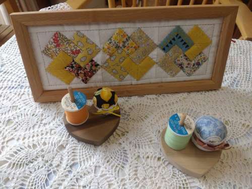 手前の針山の臺と奧のフレームはご主人の手作りとのこと