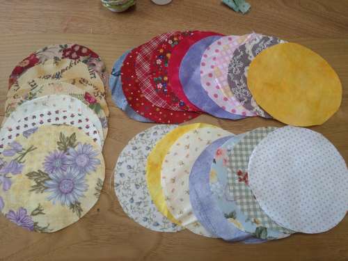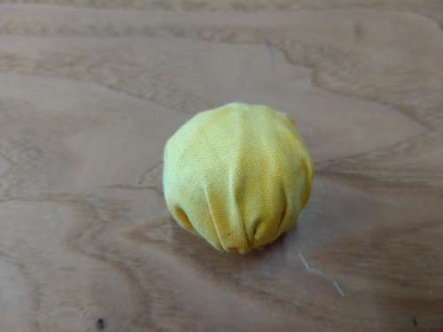円周に沿って糸を通していき、丸めた毛糸を詰めていきます