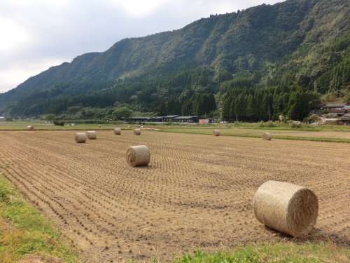 稲刈り跡は、とてもシュール! ( 家畜エサ用の稲わらロール 2016年 10月撮影 )