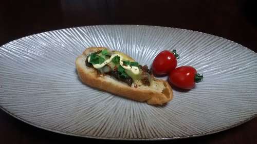 バケットに、ふきのとう味噌、チーズ、ネギ、マヨネーズをのせて
