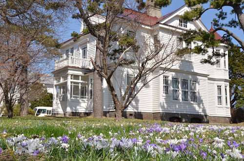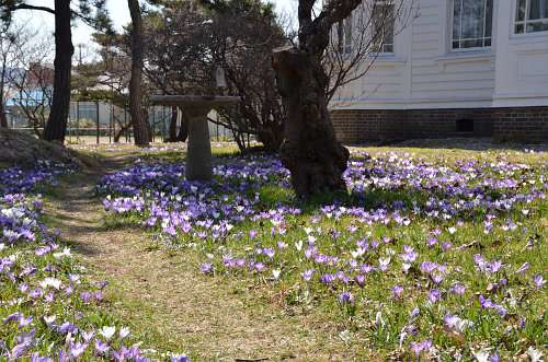 ここは、函館市電杉並町電停すぐ前の私學(xué)「遺愛學(xué)院」構(gòu)內(nèi)にある舊宣教師館、通稱「ホワイトハウス」。本格的な春の訪れとともにいっせいに花開くクロッカスの名所として知られています。