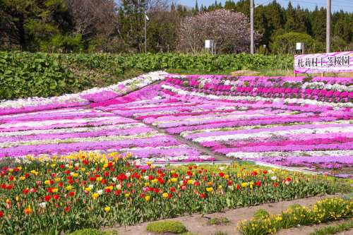 2つめは、同じく木古內町の「札苅芝桜園」。村上さんという個人の方が自宅の裏庭で芝桜を育てていたところ有名になり、最近観光スポットの仲間入りをした場所です。花畑のすぐ裏は線路で、道南いさりび鉄道の列車やJR東日本の「四季島」が走ります。