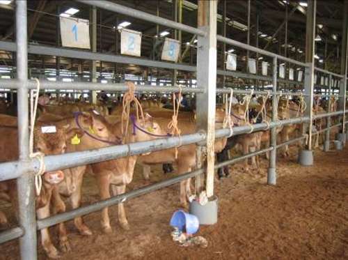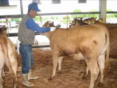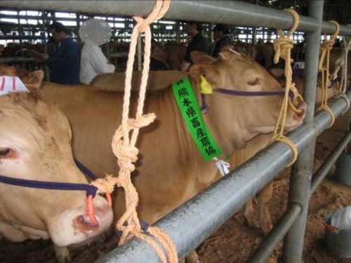日頃からお世話になっている小堀牧野組合の田島組合長のお誘いで、 家畜市場のせり市を見に行きました。 田島組合長が出品するのは生後281日の第三みつひめと生後285日の 第二みなみの2頭の女の子。生まれたときには約30kgだった體重が 今では300kgを超えています。 繋留所には続々と子牛が入ってきます。 中には売られていくのが判るのでしょう、トラックから降りるのをいやがり、 暴れる牛もいました。 飼い主との別れを惜しむかのように240頭の牛が鳴いています。 田島組合長も最後のお手入れ。愛情を込めて丁寧にブラシで磨き上げると 気のせいか子牛もうっとりしているように見えました。 せりの前に開催された品評會で第三みつひめ號は見事推奨牛に選ばれました。 リボンをつけてもらい得意そうな顔の第三みつひめ。 生産者は熊本県全域ですが、購入者は九州、四國はおろか北海道や 東北地方からも來ているとのこと。 ヘルシー志向であか牛が見直されており、北海道でも多く肥育されているようです。 さて、いよいよせりの開始。 電光掲示板がめまぐるしく変動し、30秒ほどで次々と購入者と 価格が決まっていきます。 せりはあっというまに終わり、9ヶ月以上愛情を注いだ子牛たちともここでお別れ。 なにかしら感傷的になってきます。みんな元気でね。 ※上記寫真は全て平成23年5月撮影