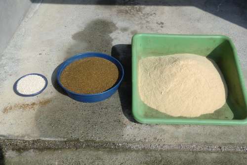 「ボカシ肥料」の材料です。右から米ぬか、菜種油粕、骨粉