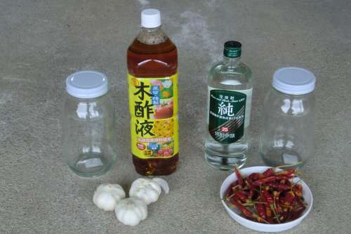木酢液とニンニク、焼酎とトウガラシを組み合わせます。