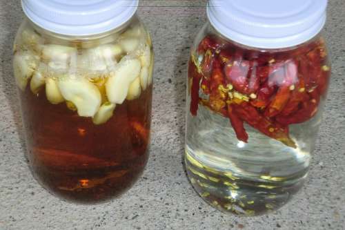 仕込みを終えた、ニンニク液とトウガラシ液です。