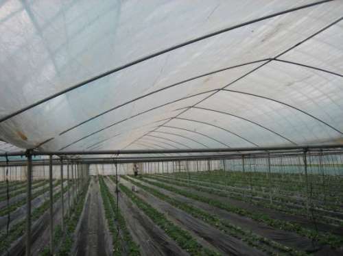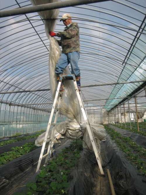 ビニールハウスの內側にもう一枚ビニールを貼って二重張りにし、