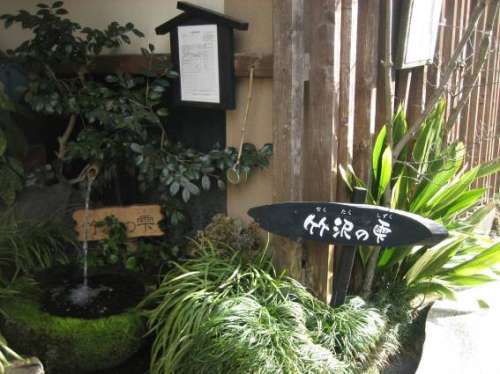 軒先にそれぞれ工夫を凝らして湧き水を提供しています。