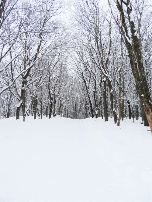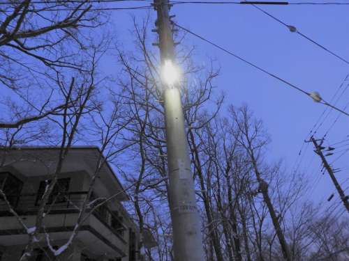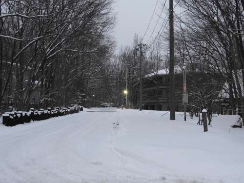 冬將軍の頑張りのおかげで、今年の冬は、雪の積もった白い道に事欠くことはありません。ここはリゾート內のホテルにほど近い白い道です。夕暮れですが、積雪のおかげでぼんやりと明るいですね。