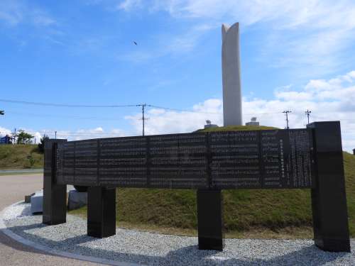 多くの被災地で、海岸付近に復興公園を造成し、津波発生時の避難場所を兼ねたタワーや丘などを整備しています。閖上においても公園の中に、慰霊塔と、津波で犠牲になった964名の芳名碑が建立されていました。現天皇皇后両陛下が、閖上を被災地訪問された際に詠まれた和歌も刻まれています。