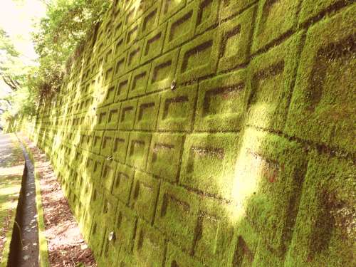 四方山の山道で、興味を惹かれる光景を目にしました。苔の壁です。蔵王では苔の道を歩くのを楽しみにしている私ですので、苔を見つけると、つい反応してしまいます。石垣ならもっと見事に見えるのでしょうが、殘念ながら苔が密生している土臺となるのはブロックでした。それでも、こんな広範囲の苔は見たことがありません。ムラなく生えた綺麗な緑色の苔がびっしり、縦3メートル橫10メートル以上はあるでしょうか。たくさんの人にも見せてあげたいと思わずにはいられないほどの、見事な苔の壁でした。