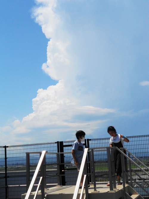 夏といえば「入道雲」。 ここは、前々回ご案內した名取市閖上の海にほど近いサイクルスポーツセンターにある新しい宿泊施設「ゆりあげ溫泉輪りんの宿」の屋上です。最近なぜかこちら方面を訪れる機會が多く、この日は孫たちとやって來ました。いつもの夏らしい平凡な景色ではありますが、雲はともかく、この暑いのに孫たちがマスクをしているのが、いかにもコロナ受難の時代を映していて、後年話題になりそうな予感がします。