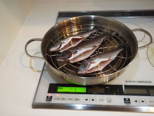 渓流魚の場合、いつもはもっと大型のスモーカーでスモークウッドを使って丸1日(8時間程度)かけて溫燻にするのだが、今回は數も少なく手間もかけない方針なので、燻製用の鍋を使った。