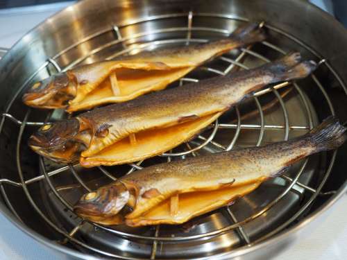 3.燻製用の鍋に魚を並べ、蓋をして2時間ほどスモーク