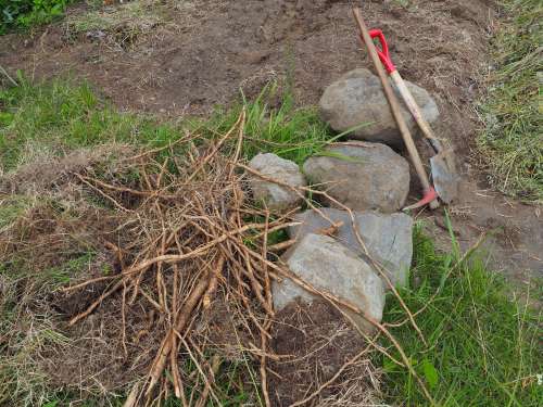 庭を掘り起こす際に出てくるもの。左から、草のシート、トウヒの根、大石。大きな石は持ち上げられないので少しずつ転がして移動する。
