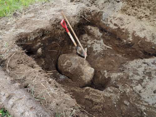 苦労してなんとか草のシートを剝がすと、次はさらに手ごわい大きな石が待ち構えている。數十kgぐらいまでの石なら少しずつ転がして移動できるが、百kgを超えるぐらいになると無理なので周りの土をより深く掘って石を沈めて土の深さを確保するようにしている。