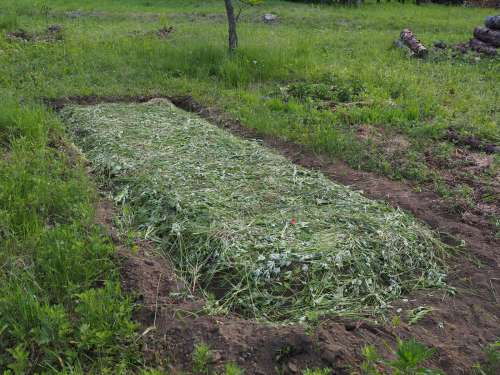 完成した畝。肥料は入れなかったが土には腐葉土を混ぜ込んだ。ビニールのマルチはできるだけ使いたくないので周囲の草を刈って草マルチにする。