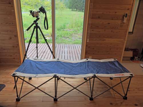 今回、撮影に用いた機材と星見用の簡易ベッド。車での移動もなく、自宅のデッキから最初にカメラでインターバル撮影に設(shè)定し、あとは流星を眺めているだけの実にお気楽な撮影である。