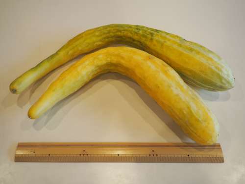 種採り用に黃色くなるまで待ってから採取したキュウリ、この後1週間ほど室內で追熟させた。