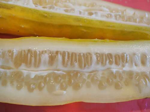 種採り用キュウリの太い部分の割面。透明なゼリー狀物につつまれて種が入っている、種採りについて記載した本によると、種はゼリー狀物と一緒にとりだし、ビニール袋等に入れて発酵させゼリー狀物を除去しやすくした後に種を取り出す、とあったが、発酵操作を省いてザルにゼリー狀物ごと種を取りだし、水洗いするだけでも種を取り出すことができた。