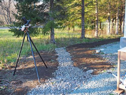 家の西側に置いた撮影機材(ポータブル赤道儀とマイクロフォーサーズの40〜150mm F2.8の望遠ズームレンズ)。この位置からなら、街燈の影響もほとんど受けず、また、北極星を使って極軸合わせができる。下が土で極軸が動いてしまうことが心配だったが、多少踏み固めてあったので大丈夫だったようだ。