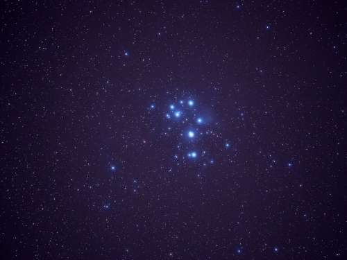 M45(プレアデス星団)。青いガスもはっきり確認できる。150mm(300mm相當) f/2.8 ISO-3200 60秒露出。その昔、初めて低倍率の望遠鏡でこれをみた時は、その息を飲むような美しさに圧倒されていつまでも眺めていたことを思い出す。