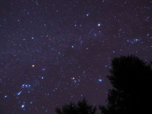 冬の星座で賑やかな西の空。西側は木によって街燈の明かりが遮られ、その影響をほとんど受けずに撮影できる。オリオン座、ヒアデス星団、プレアデス星団、ぎょしゃ座など。うっすらとだが天の川も判別できる。12mm(24mm相當) f/2.5