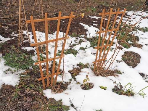 こちらはラズベリー。効果のほどは不明だが、一応広がった枝を麻紐で緩くトレリスに巻き付けるようにしてみた。