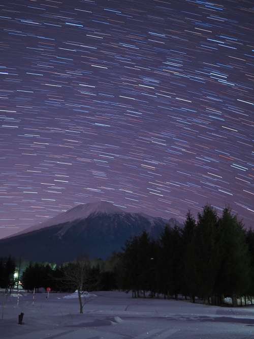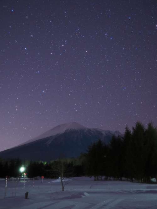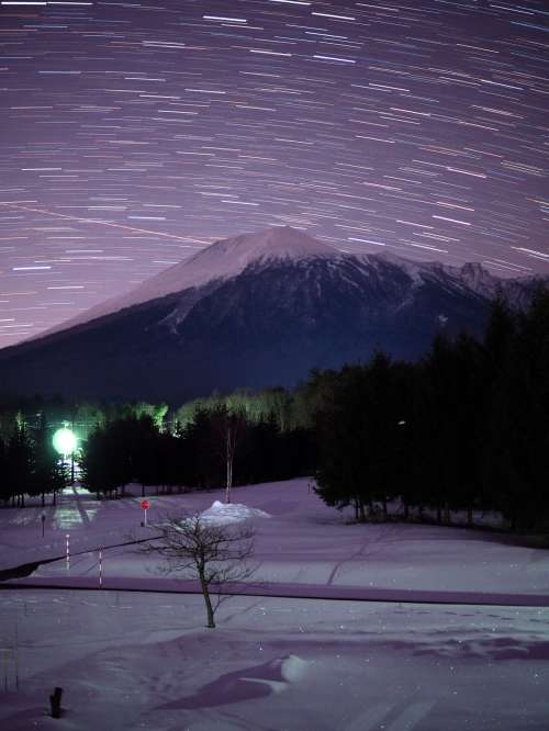 待望の雪景色での撮影であるが、困ったことにこの時期の夜半過ぎには巖手山の上の空には目立った星座等が見當たらず、いつものポータブル赤道儀を用いた追尾撮影では空が大変地味なものになってしまう。