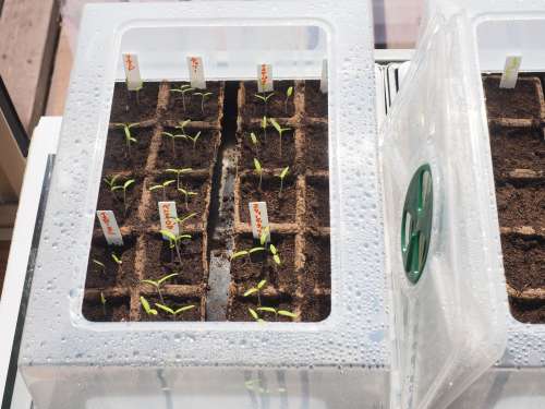 今年は昨年の失敗を生かし溫度を高めに管理したのが奏功したようで、種まきから3日程で種を蒔いた固定種のトマト6品種のすべてが発芽した。これらの中に市販のF1品種に負けない風味のものがあることを期待している。