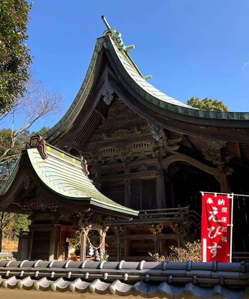 駐車場に向かい、後ろを振り返るとえびすの幟が神社と青い空に