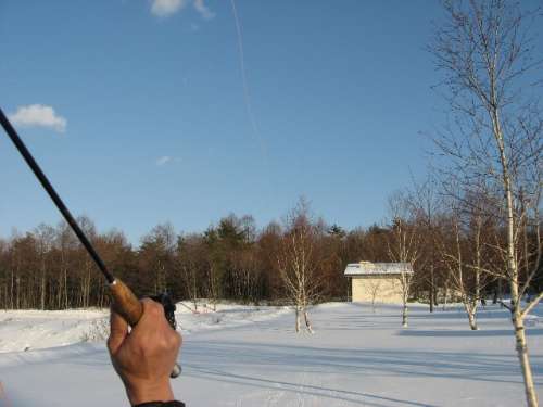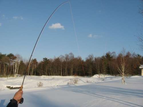 練習(xí)には前と後に10m、合計20mもの広いスペースが必要になります、森林住宅地ではこのぐらいのスペースの確保は難しくありません、さらに雪に覆われた地面は樹脂コーティングされたフライラインをアスファルトや土の摩擦から守ってくれます、まさにこの上ない練習(xí)環(huán)境です