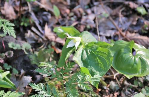 シロバナエンレイソウとも呼ばれ、オオバナノエンレイソウより花弁が小さく橫~斜め下向きに花が咲きます