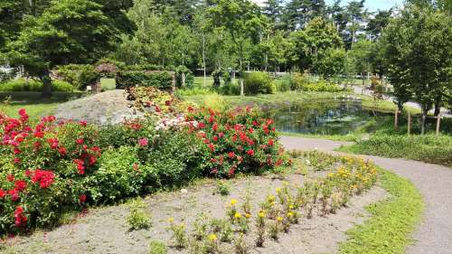 奧に進んでいくと、花の植えられたエリアがあり、いろんな花が咲き誇っています。ちょっとピークは過ぎていたようですが、バラの植えられた場所では良い香りが漂ってました。オジさんには関係ありませんが、この辺はなかなか最近の観光地には必須のインスタ映えしそうな感じで作られていました。