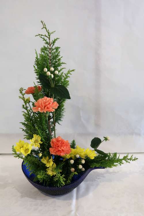 秋の花材を使ったリンドウや菊、ユリ?トルコキキョウ?柳など