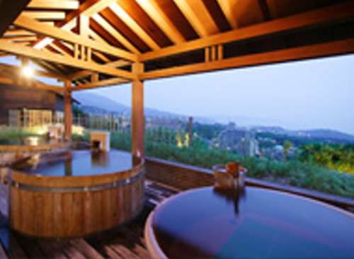 ヒノキで作った直徑150センチの樽湯。               高臺の心地よい風を感じるほぐし湯。