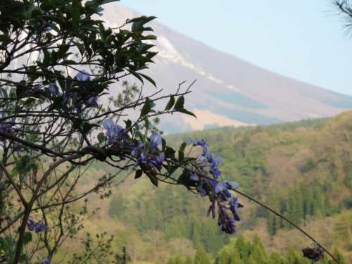 4月末から5月初旬が見頃のフジ。後ろには大山の稜線。