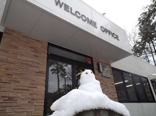 1月中旬。 記録的な暖冬が続き、 大山リゾートも積雪のない冬が続いておりましたが やっと冬らしく白銀の世界に包まれました。 この日はウェルカムオフィス前で積雪約8センチ。 しばらく寒い日が続くようなのでしばらくはこの景色が楽しめそうです。 分譲地內の道路はスタッドレスタイヤで通行できる狀態ですので 皆様、安心してお越し下さい。 スタッフが作成したかわいらしい雪だるまが皆様をお迎えするかも!?