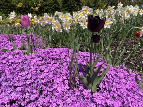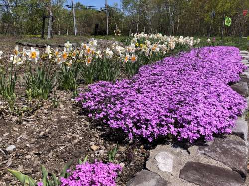 は芝桜と水仙の花です。芝桜はどんどん場所が広がってきており、石垣にもうすぐ